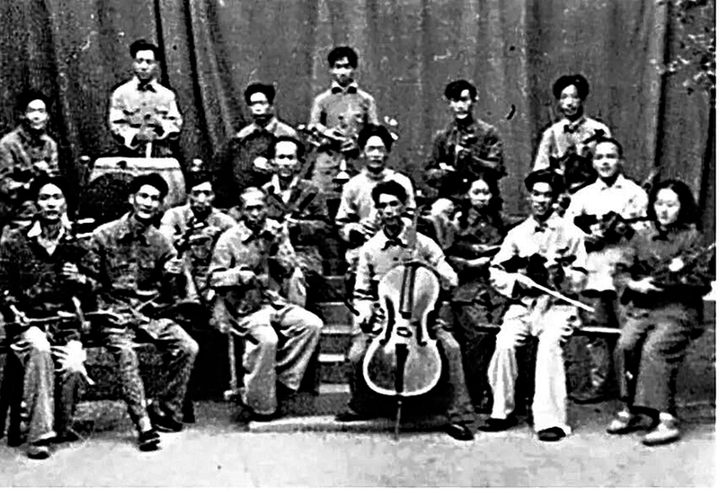 ● 延安时期的乐队,二排右三、大提琴手后面手持黑管者为卢肃