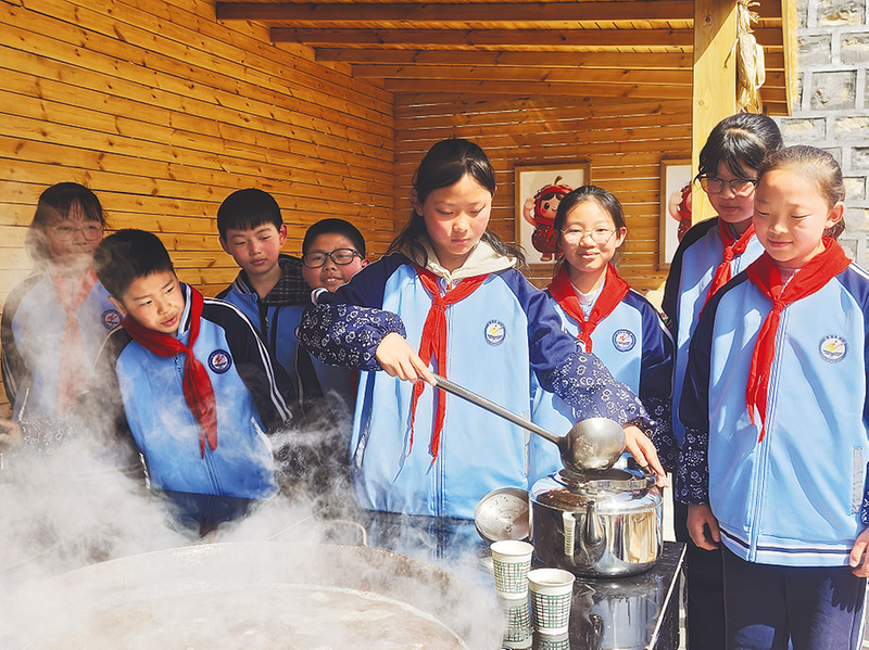 春之约,融于实践。“金扁担农具馆”的学生依次登记领取农具。低年级学生弯腰捡拾杂草碎石,做“土地小卫士”;中年级学生边翻地边测量,将数学知识“种”进田垄;高年级学生结合土壤检测,探究养护之道。劳动间隙,“小小炊事班”社团的学生熬好绿豆稀饭,师生家长围坐共饮,《军民大生产》《南泥湾》的旋律在田间回荡,红色故事在泥土旁讲述。科学、语文等学科教师也将课堂延伸至田间,让知识在劳动中生根发芽。