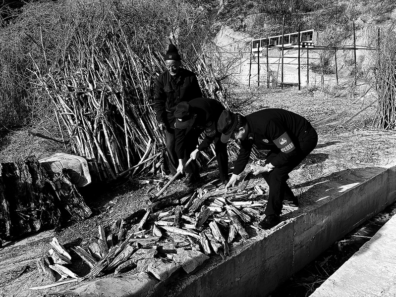 得知老人家中还缺些柴火,队员们顾不得休息,拿起斧头忙活起来。劈柴、码放,动作娴熟利落,不一会儿,一堆整齐的柴火便堆放在屋檐下。