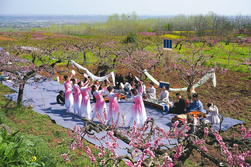 3月31日,人们在西安市长安区王莽街道土门峪村桃花林中开展文化活动。