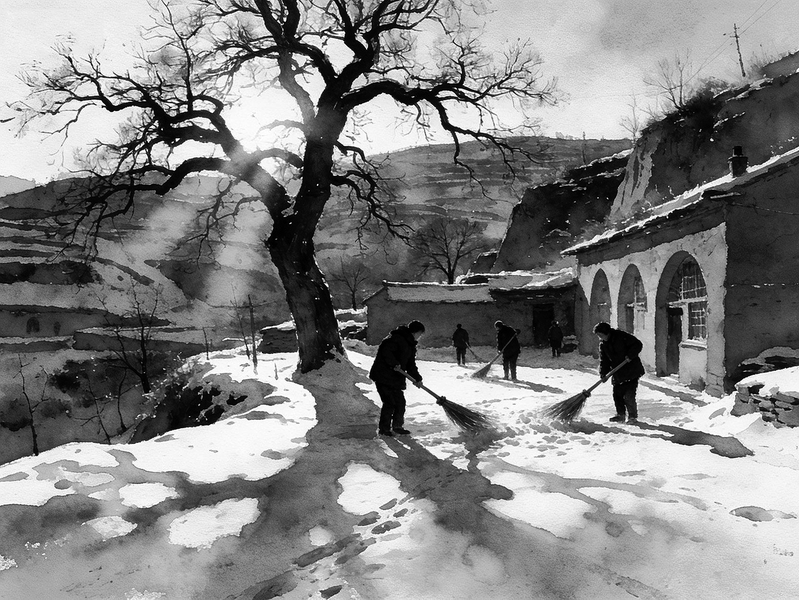 “ 走,咱们一块朝王家塬扫过去,你们愿意吗?”经前院大叔提议,大家一起聚集在村口,稍微歇息了一会儿,就从我们村头向王家塬清扫过去。当然了,作为半大小子的我干着比较轻松的活儿,只是拿着扫帚,跟在铲雪的大人后面往左右两边扫出能够走过架子车宽度的路来。