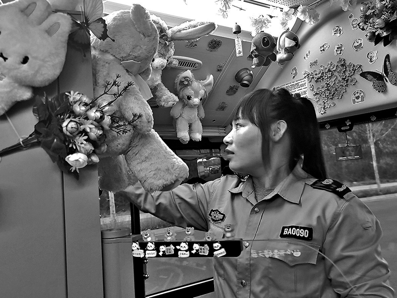 ▲ K212路公交车司机周院英正在整理车上的玩偶 记者 郑鹏 叶四青 孙艳艳