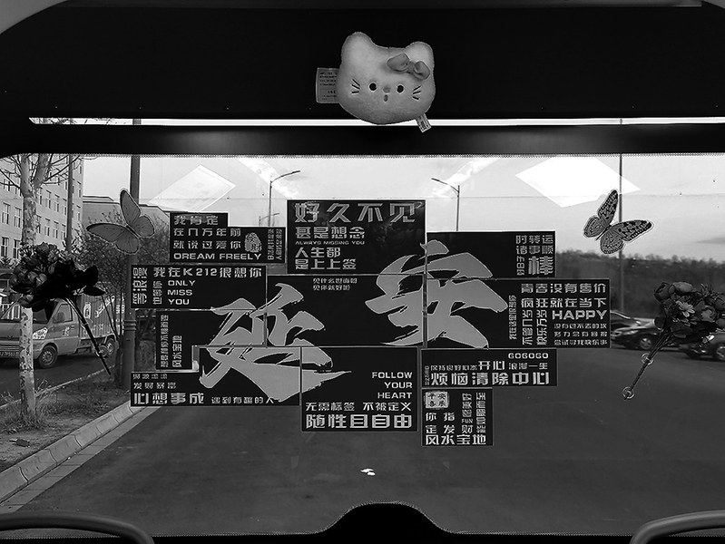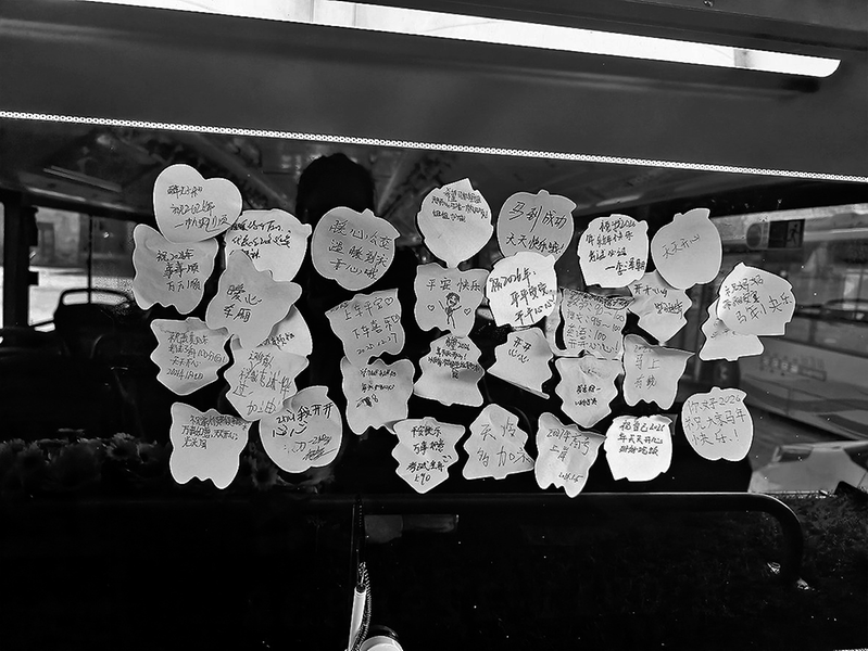 ● K212路公交车“童话车厢”的车厢尾,是对延安和乘客的满满祝福