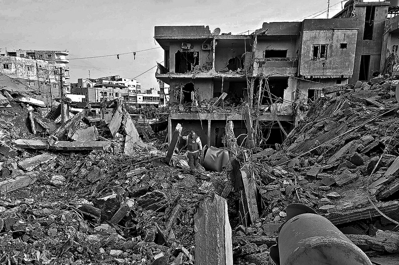 4月4日,在黎巴嫩南部海滨城市提尔附近区域,救援人员查看被炸毁的建筑。