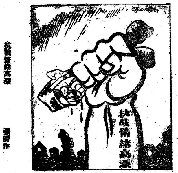 ● 1938年6月17日《新华日报》报眼——《抗战情绪高涨》 张谔 作 打开泛黄的《新华日报》老报纸,1938年6月17日至1940年10月23日,几乎每天的头版,都有一幅宣传抗战主题的新闻漫画出现在报眼位置,如一发发射向敌人的子弹,鼓舞着无数爱国志士。这些漫画的作者张谔,是一位在革命的风浪中成长起来的艺术家。