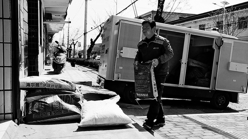 4月9日上午9时,在黄陵县邮政分公司储运中心田庄镇寄递物流综合服务点,工作人员郑长海正在从电动无人快递车上搬运货物。