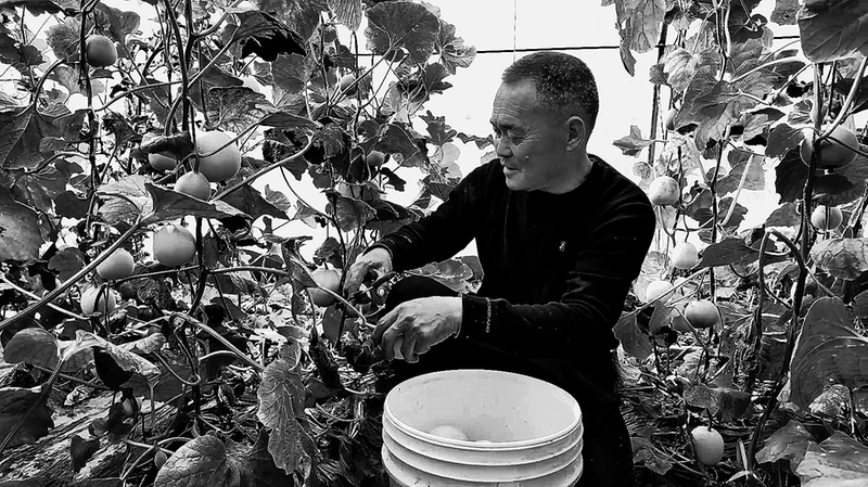 步入代家沟村,错落的农家小院、洁净的柏油马路与整齐的温室大棚相映成趣。掀开棚帘,热浪裹挟着扑鼻的瓜香涌来。抬眼望去,翠绿藤蔓沿吊绳向上攀爬,圆润饱满的小瓜在绿叶间若隐若现,色泽鲜亮,引人垂涎。