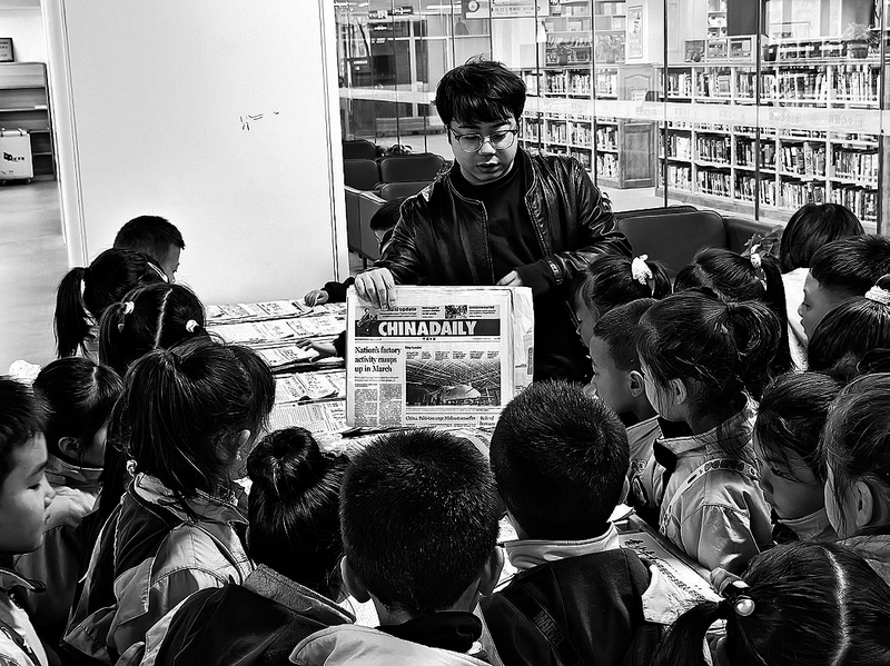 ● 孩子们在图书馆共读英文报纸,乐享阅读时光